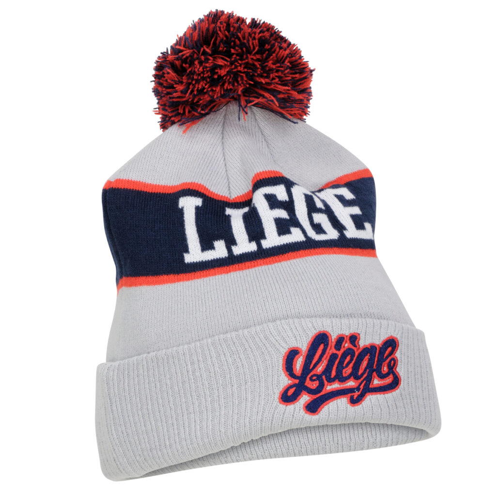 – Un modèle blason, avec pompon aux couleurs emblématiques. – Un modèle Liège, avec pompon et broderie au nom de notre ville